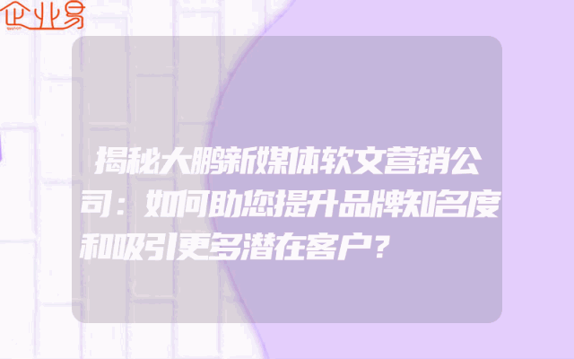 - 揭秘大鹏新媒体软文营销公司:如何助您提升品牌知名度和吸引更多潜在客户?