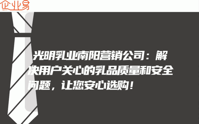 - 光明乳业南阳营销公司:解决用户关心的乳品质量和安全问题,让您安心选购!在当今社会,食品安全问题一直是人们关注的焦点。尤其是乳制品,作为人们日常生活中不可或缺的食品之一,其质量和安全问题更是备受关注。光明乳业南阳营销公司深知消费者的需求和担忧