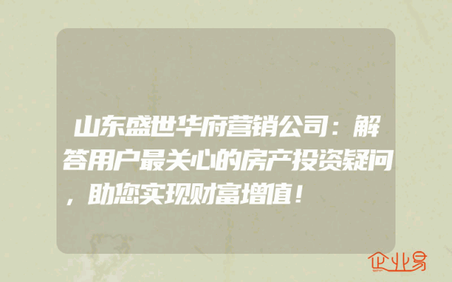 - 山东盛世华府营销公司:解答用户最关心的房产投资疑问,助您实现财富增值!