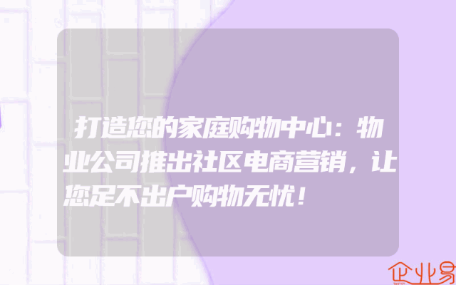 - 打造您的家庭购物中心:物业公司推出社区电商营销,让您足不出户购物无忧!
