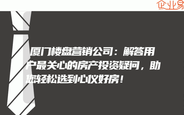 - 厦门楼盘营销公司:解答用户最关心的房产投资疑问,助您轻松选到心仪好房!