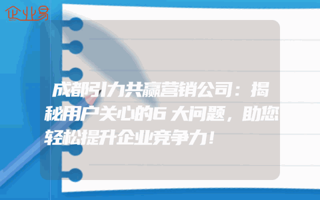 - 成都引力共赢营销公司:揭秘用户关心的6大问题,助您轻松提升企业竞争力!在当今激烈的市场竞争中,企业要想脱颖而出,必须具备强大的竞争力。而提升企业竞争力的关键之一,就是深入了解用户的需求和痛点。本文将从用户的角度出发,为您揭秘用户关心的六大问
