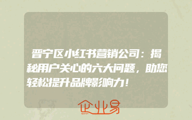 - 晋宁区小红书营销公司:揭秘用户关心的六大问题,助您轻松提升品牌影响力!随着社交媒体的普及,越来越多的企业开始关注小红书这个平台,希望通过小红书来提升品牌影响力。然而,要想在小红书上取得好的效果,企业需要了解用户关心的问题。本文将为您揭秘用户