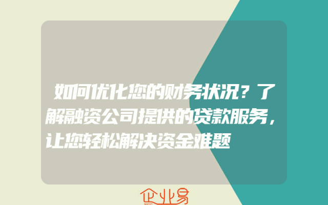 - 如何优化您的财务状况?了解融资公司提供的贷款服务,让您轻松解决资金难题