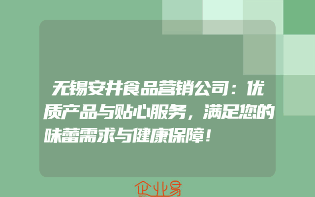 - 无锡安井食品营销公司:优质产品与贴心服务,满足您的味蕾需求与健康保障!在当今快节奏的生活中,人们对美食的需求不仅仅是满足口腹之欲,更注重产品的健康性和口感。无锡安井食品营销公司正是这样一家致力于为广大消费者提供优质产品和贴心服务的公司。他们