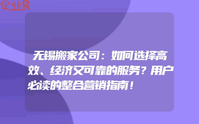 - 无锡搬家公司:如何选择高效、经济又可靠的服务?用户必读的整合营销指南!