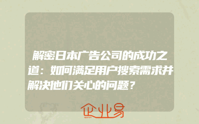 - 解密日本广告公司的成功之道:如何满足用户搜索需求并解决他们关心的问题?随着互联网的普及和搜索引擎的发展,用户对信息的需求越来越多样化和个性化。对于广告公司来说,如何有效地满足用户的搜索需求并解决他们关心的问题,已经成为了取得成功的关键因素之