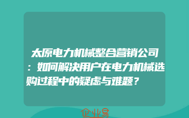 - 太原电力机械整合营销公司:如何解决用户在电力机械选购过程中的疑虑与难题?