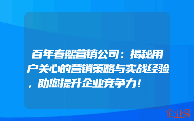- 百年春熙营销公司:揭秘用户关心的营销策略与实战经验,助您提升企业竞争力!