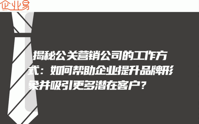 - 揭秘公关营销公司的工作方式:如何帮助企业提升品牌形象并吸引更多潜在客户?在当今竞争激烈的市场环境中,企业需要通过各种手段来提升品牌形象,吸引潜在客户。公关营销公司作为专业的品牌传播机构,能够帮助企业实现这一目标。本文将揭示公关营销公司的工作