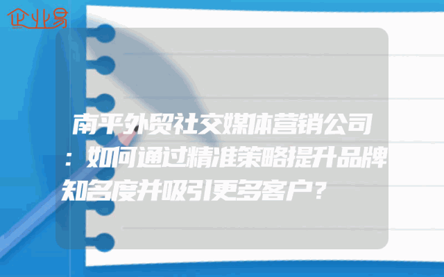 - 南平外贸社交媒体营销公司:如何通过精准策略提升品牌知名度并吸引更多客户?在当今数字化时代,社交媒体已经成为企业营销的重要工具。对于南平的外贸公司来说,利用社交媒体平台进行品牌推广和客户吸引更是必不可少的策略。本文将为你介绍如何通过精准策略提