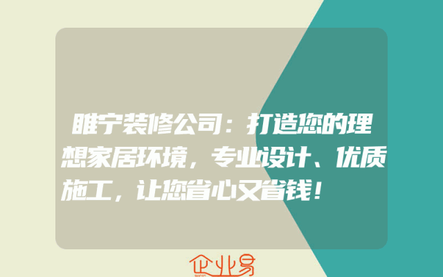 - 睢宁装修公司:打造您的理想家居环境,专业设计、优质施工,让您省心又省钱!