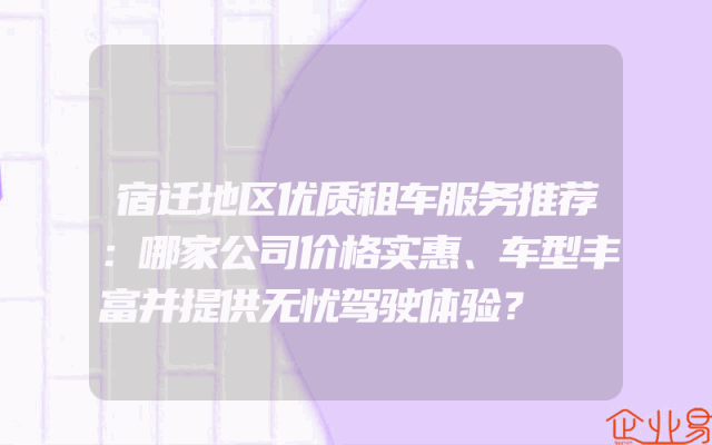 - 宿迁地区优质租车服务推荐:哪家公司价格实惠、车型丰富并提供无忧驾驶体验?在宿迁地区,如果你正在寻找一家价格实惠、车型丰富并提供无忧驾驶体验的租车公司,那么以下几家公司将是你的不二之选。首先,我们推荐的是**宿迁市宏达租车有限公司**。这家公