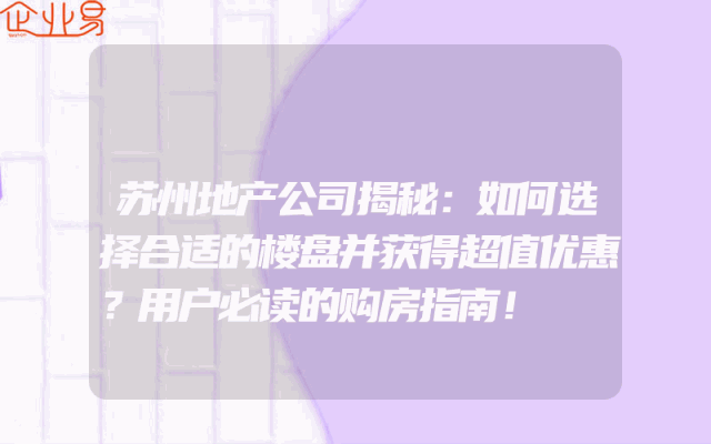 - 苏州地产公司揭秘:如何选择合适的楼盘并获得超值优惠?用户必读的购房指南!