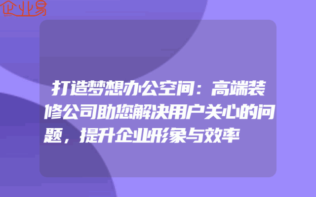 - 打造梦想办公空间:高端装修公司助您解决用户关心的问题,提升企业形象与效率在现代社会,企业的形象和效率往往决定了企业的生存和发展。为了提升企业的形象和效率,许多企业开始重视办公环境的装修。然而,如何打造一个既美观又实用的办公空间,成为了许多人