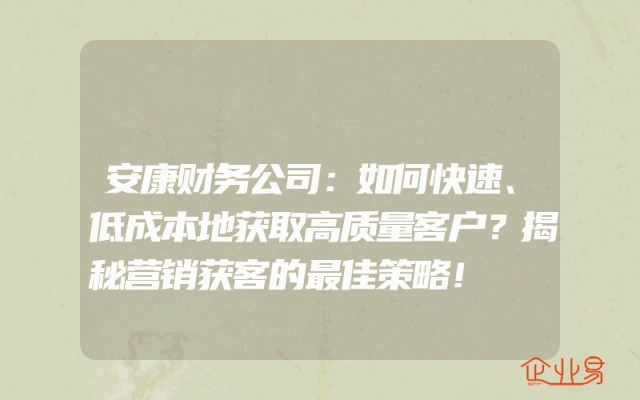 - 安康财务公司:如何快速、低成本地获取高质量客户?揭秘营销获客的最佳策略!