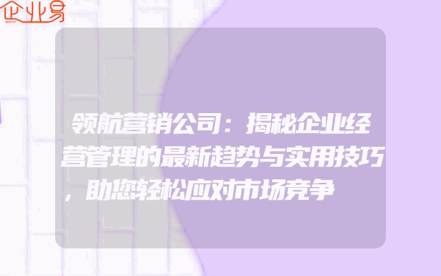 - 领航营销公司:揭秘企业经营管理的最新趋势与实用技巧,助您轻松应对市场竞争在当今竞争激烈的市场环境中,企业经营管理已经成为企业发展的关键因素。为了帮助企业更好地应对市场竞争,领航营销公司深入研究了企业经营管理的最新趋势和实用技巧,并为您提供了