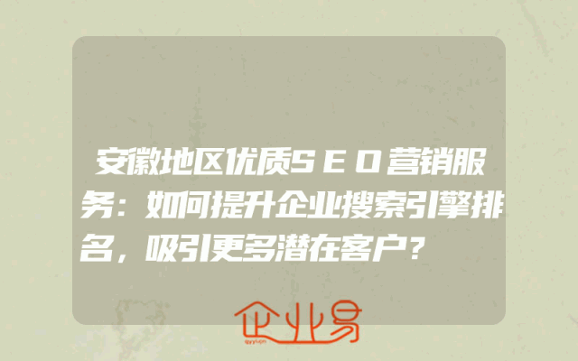 - 安徽地区优质SEO营销服务:如何提升企业搜索引擎排名,吸引更多潜在客户?在当今数字化时代,搜索引擎优化(SEO)已经成为企业提升在线可见性和吸引潜在客户的重要工具。特别是在安徽地区,由于竞争激烈,企业需要通过优质的SEO营销服务来提升自身在