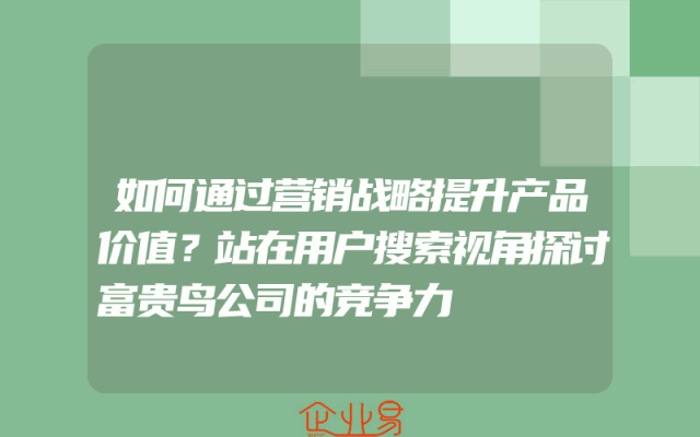 - 如何通过营销战略提升产品价值?——站在用户搜索视角探讨富贵鸟公司的竞争力在当今竞争激烈的市场环境中,企业要想在众多的竞争对手中脱颖而出,提升产品价值是非常重要的一环。本文将从用户搜索的角度出发,探讨如何通过营销战略提升富贵鸟公司的竞争力。首