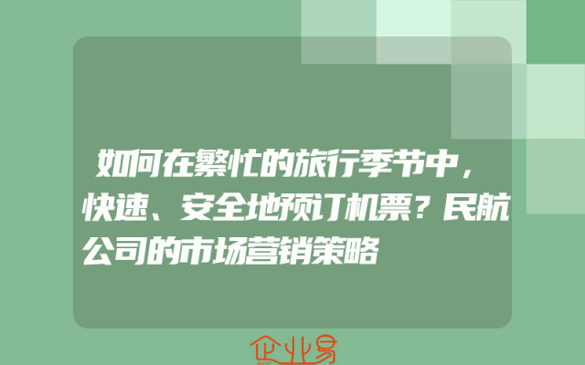 - 如何在繁忙的旅行季节中,快速、安全地预订机票?在繁忙的旅行季节,许多人都希望能够快速、安全地预订机票。然而,由于竞争激烈和信息量大,这可能是一项具有挑战性的任务。本文将探讨民航公司的市场营销策略,以帮助您更好地理解如何在这个过程中取得成功。