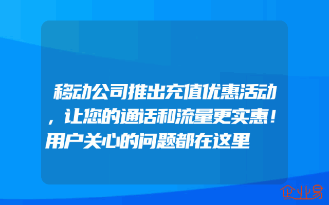 - 移动公司推出充值优惠活动,让您的通话和流量更实惠!用户关心的问题都在这里随着移动互联网的普及,手机已经成为了我们日常生活中不可或缺的一部分。为了满足用户对通话和流量的需求,各大移动公司纷纷推出了各种各样的优惠政策。近日,一家知名的移动公司也