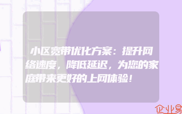 - 小区宽带优化方案:提升网络速度,降低延迟,为您的家庭带来更好的上网体验!在现代社会,互联网已经成为我们生活的重要组成部分。无论是工作、学习还是娱乐,我们都离不开网络。因此,一个稳定、快速的网络环境对于我们的生活质量有着至关重要的影响。特别