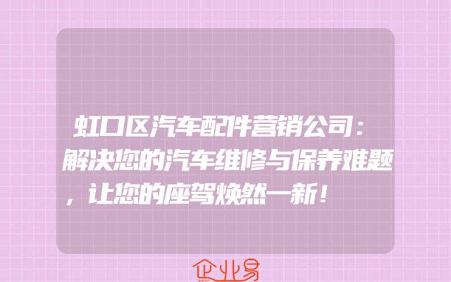 - 虹口区汽车配件营销公司:解决您的汽车维修与保养难题,让您的座驾焕然一新!在现代社会,汽车已经成为人们出行的主要工具之一。然而,随着汽车使用时间的增加,汽车维修与保养问题也逐渐显现出来。为了解决这一难题,虹口区有一家专业的汽车配件营销公司,为