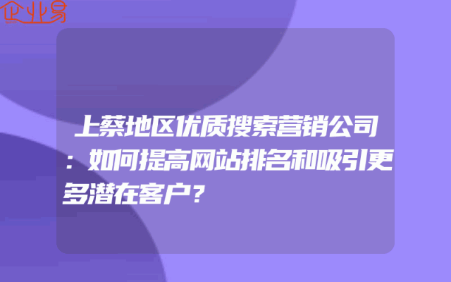 - 上蔡地区优质搜索营销公司:如何提高网站排名和吸引更多潜在客户?在当今的数字化时代,企业要想在竞争激烈的市场中脱颖而出,必须重视网络营销。而搜索引擎营销(SEM)作为网络营销的重要手段之一,对于提高网站排名和吸引潜在客户具有重要意义。那么,如