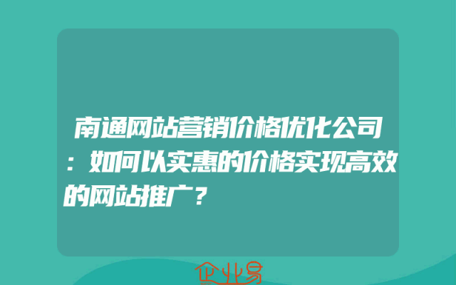 - 标题:南通网站营销价格优化公司:如何以实惠的价格实现高效的网站推广?在当今的数字化时代,企业需要通过网络来进行有效的营销活动,以扩大品牌知名度和吸引潜在客户。然而,对于许多小型和中型企业来说,他们可能面临着预算有限的问题。在这种情况下,如何