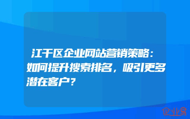 - 江干区企业网站营销策略:如何提升搜索排名,吸引更多潜在客户?在当今的数字化时代,企业网站已经成为了企业展示形象、宣传产品和服务的重要平台。然而,随着互联网信息的爆炸式增长,企业网站面临着激烈的竞争。要想在众多的网站中脱颖而出,吸引更多的潜在