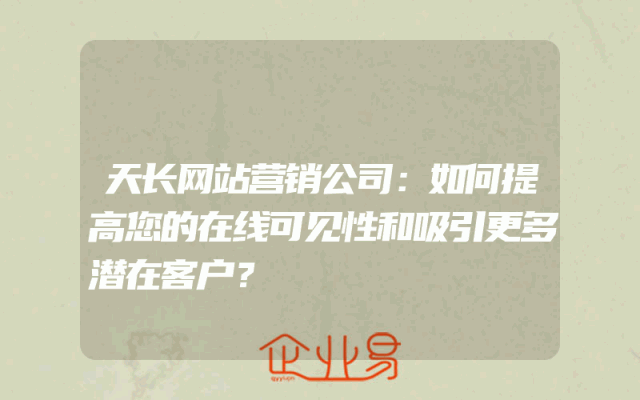 - 天长网站营销公司:如何提高您的在线可见性和吸引更多潜在客户?在当今的数字化时代,企业需要通过网络来扩大其业务范围和影响力。然而,仅仅拥有一个网站并不足以确保成功。为了提高在线可见性和吸引更多的潜在客户,企业需要采取一系列有效的网站营销策略。