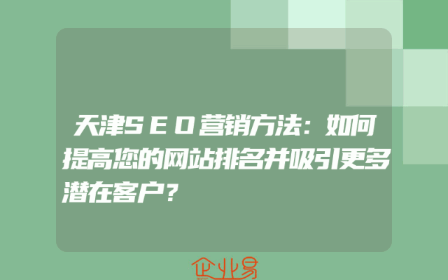- 天津SEO营销方法:如何提高您的网站排名并吸引更多潜在客户?在当今的数字化时代,搜索引擎优化(SEO)已经成为了企业成功的关键因素之一。特别是对于那些依赖在线渠道进行业务的公司来说,拥有一个高排名的网站是非常重要的。本文将为您介绍一些天津S