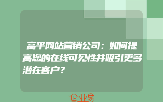 - 高平网站营销公司:如何提高您的在线可见性并吸引更多潜在客户?在当今的数字化时代,企业需要通过互联网来扩大业务范围和吸引更多的潜在客户。然而,随着竞争的加剧,仅仅建立一个网站已经不足以让您在众多企业中脱颖而出。为了提高在线可见性和吸引更多的潜