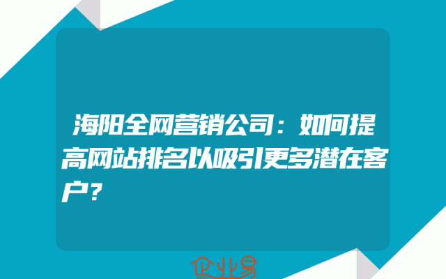 - 海阳全网营销公司:如何提高网站排名以吸引更多潜在客户?在当今的数字化时代,企业需要通过互联网来扩大其业务范围和影响力。然而,仅仅建立一个网站是远远不够的。为了吸引更多的潜在客户,企业需要确保他们的网站能够在搜索引擎中获得良好的排名。这就是为