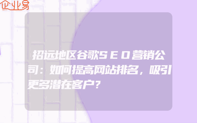 - 招远地区谷歌SEO营销公司:如何提高网站排名,吸引更多潜在客户?在当今的数字化时代,企业需要通过互联网来扩大业务范围和吸引潜在客户。而搜索引擎优化(SEO)成为了企业获取在线曝光和增加网站流量的重要手段之一。对于招远地区的企业来说,选择一家