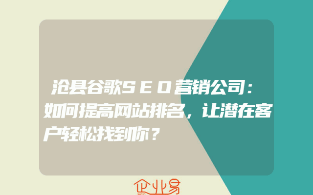 - 沧县谷歌SEO营销公司:如何提高网站排名,让潜在客户轻松找到你?